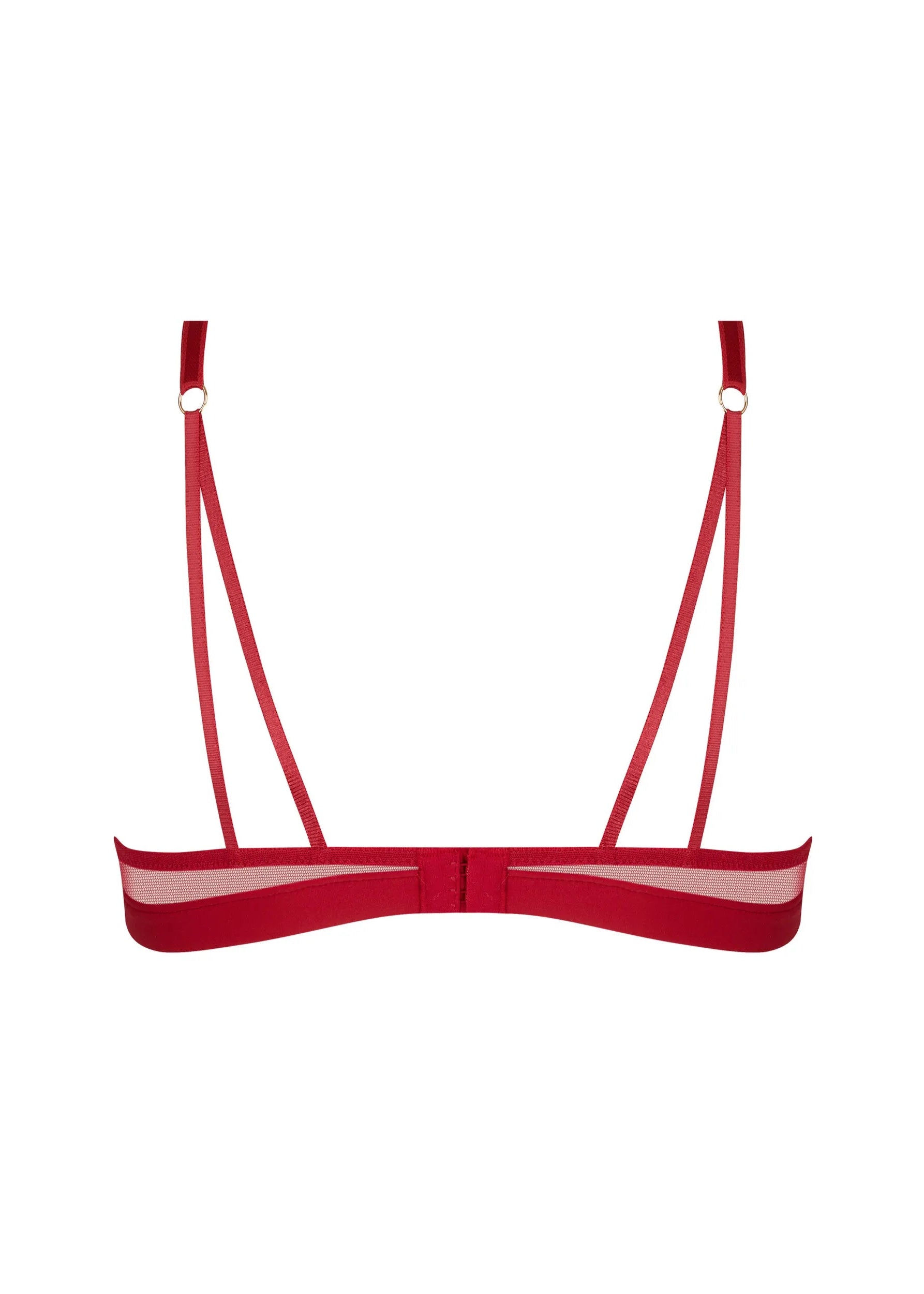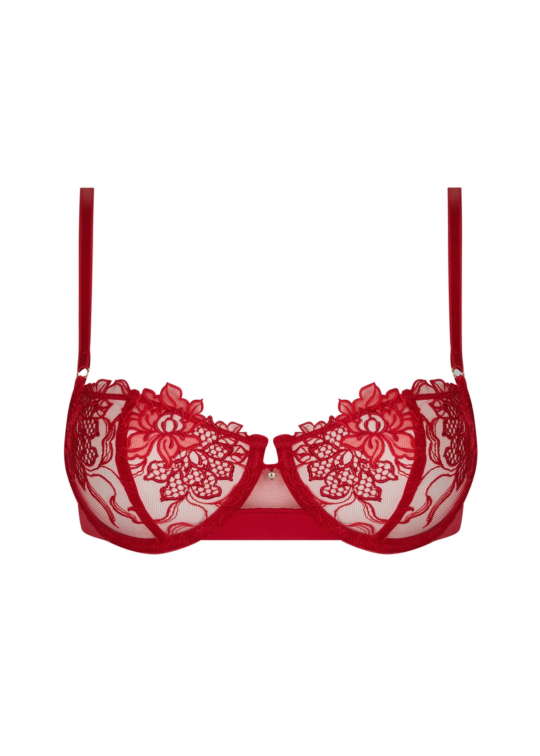 Adorable en Sexy, a beauty from Lise Charmel! Demi cup bra with vertical seam. Sweetheart neckline shows off an enhanced bustline. Scalloped cup with multifilament embroidery, featuring an organza flower appliqué. The bra band is in two parts, consisting of a mesh band at the bottom and lined tulle at the top. The start of the front straps are embellished with rings, while the back straps, which are finer, form a crossover. Rhinestone jewel at the top of the cleavage.