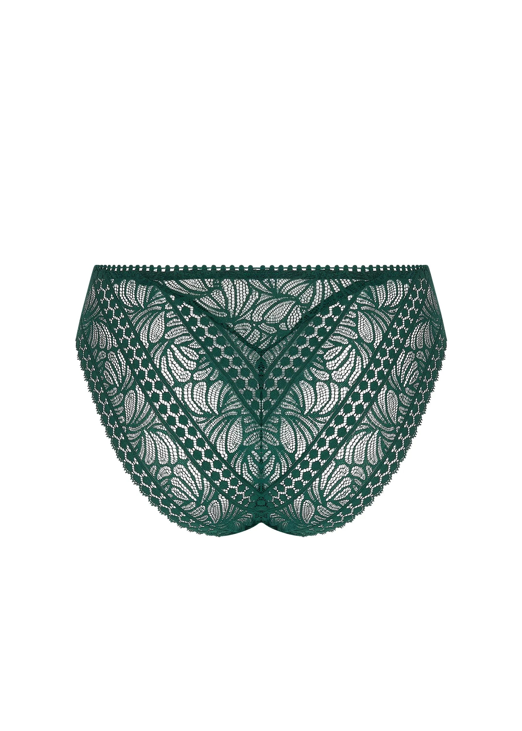 Antigel's Atelier Seduction in dark green. Italian Bikini with sheer lace. Fancy sheer back with gold ring.