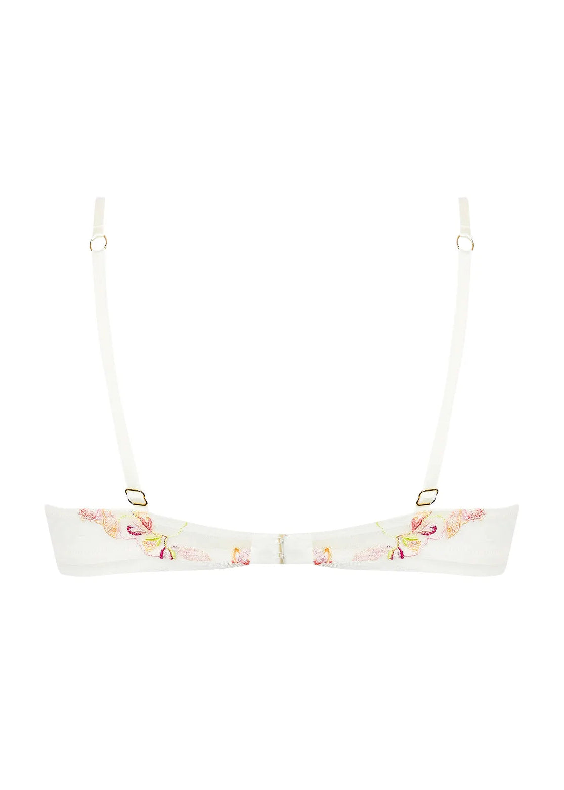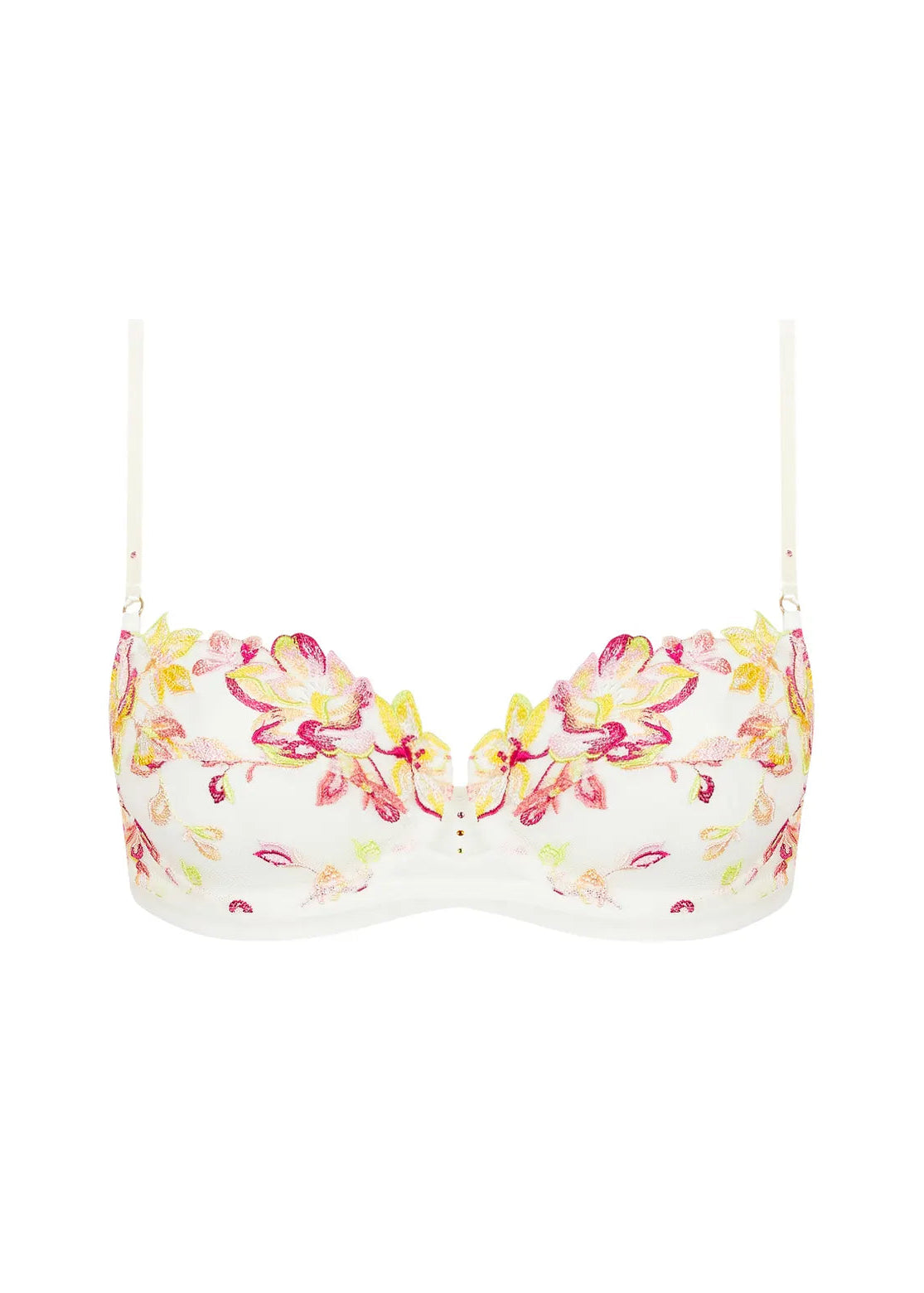 Lise Charmel's soft demi cup bra with underwire, and horizontal seam. Top and bottom cups in multicolor embroidery, bra-band in elastic tulle with embroidered inserts on the sides and center back. Three rhinestone motif at the cleavage and rhinestones on the straps.