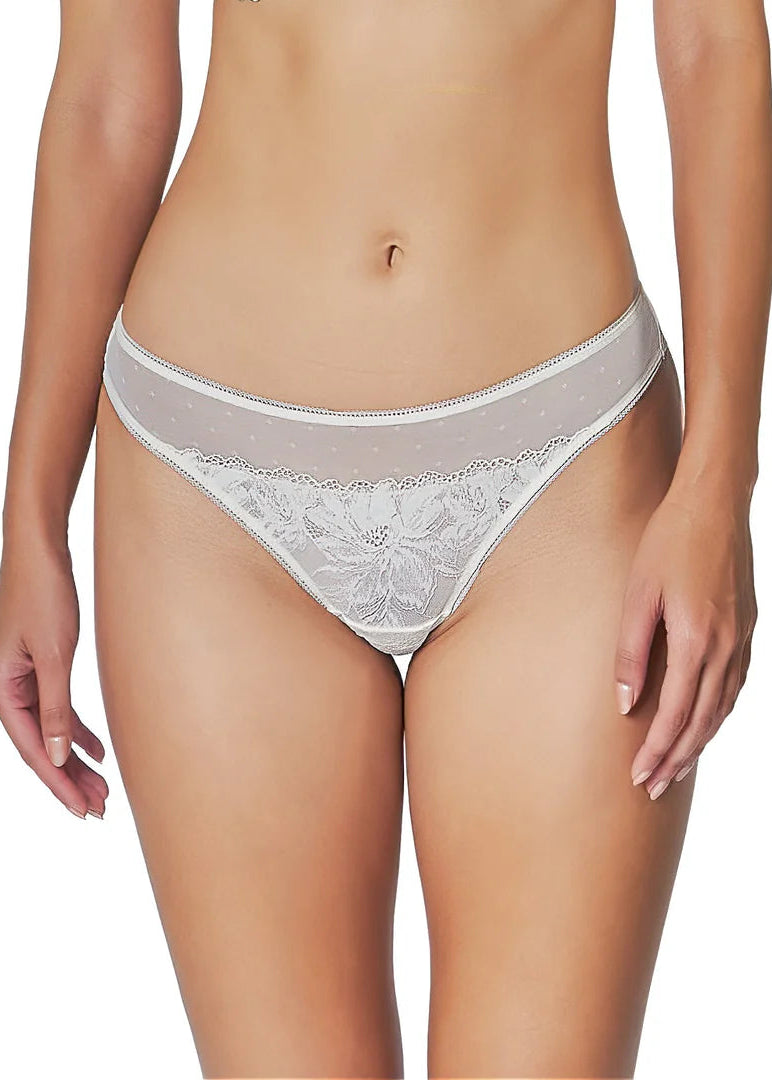 Huit's Heart of Glass line tanga invokes simple, pure romance. Feminine imported stretch floral lace front panel surrounds your bottom. Romantic flowers surround your body while providing comfort and a mesh back for a seamless finish.